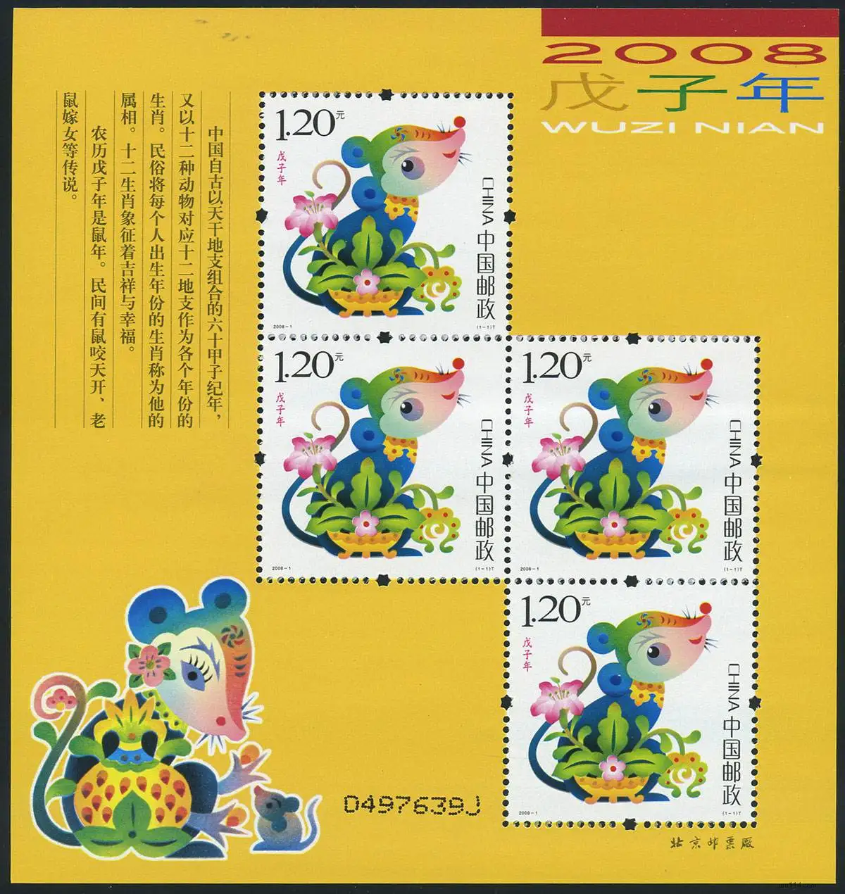 注:同时发行《戊子年》邮票版式三(整张枚数:4枚;整张规格:120×130毫米),作为2008年纪特邮票全额交款预订户赠品。