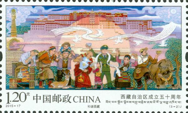 中国邮政定于2015年9月1日发行《西藏自治区成立五十周年》纪念邮票1套3枚。