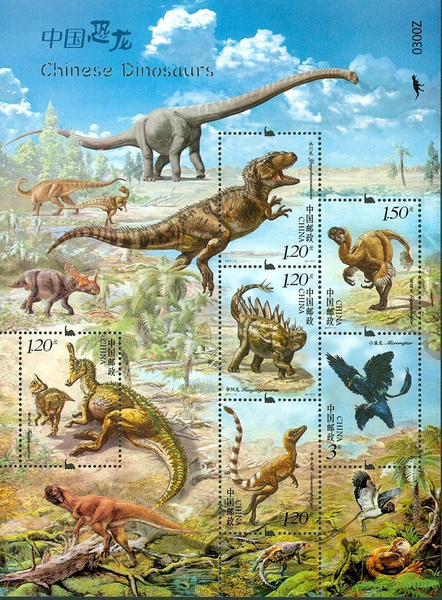 中国邮政定于2017年5月19日发行《中国恐龙》特种邮票1套6枚,小型张1枚。详情如下: