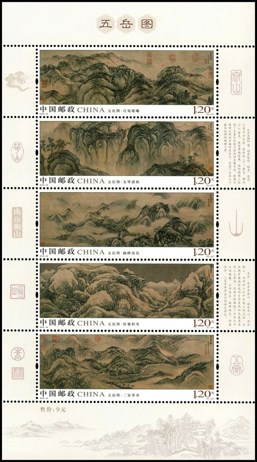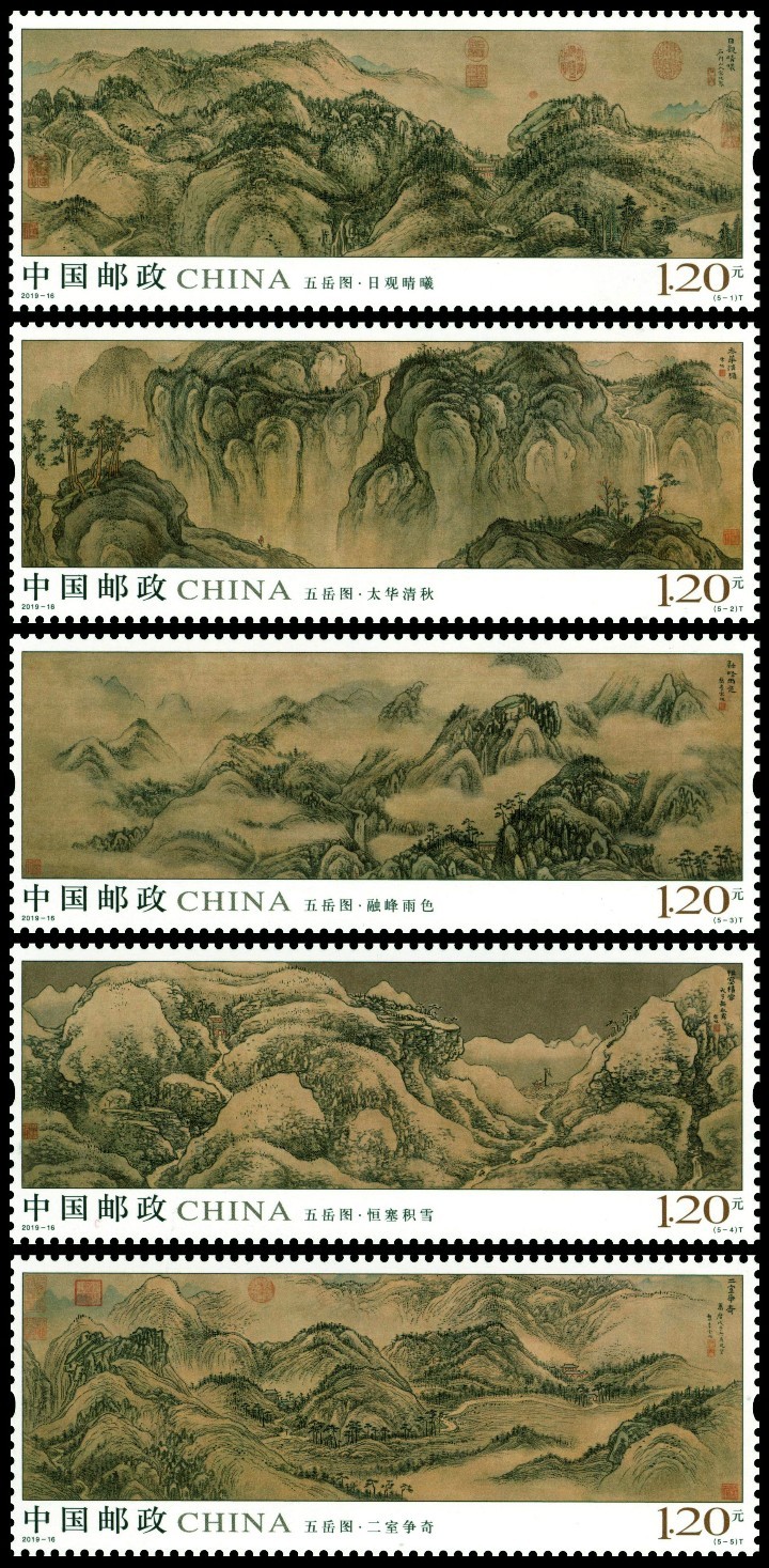 中国邮政定于2019年8月3日发行《五岳图》特种邮票1套5枚,小全张1枚。详情如下: