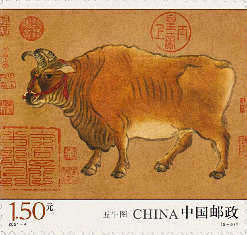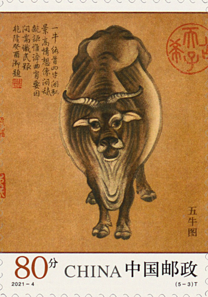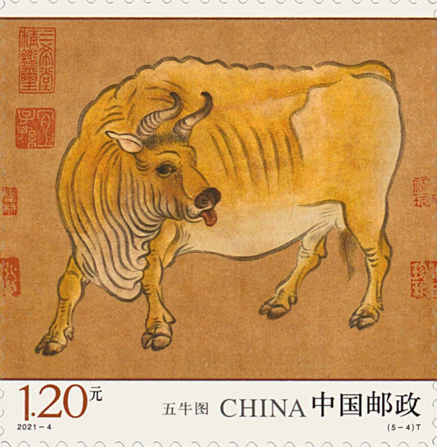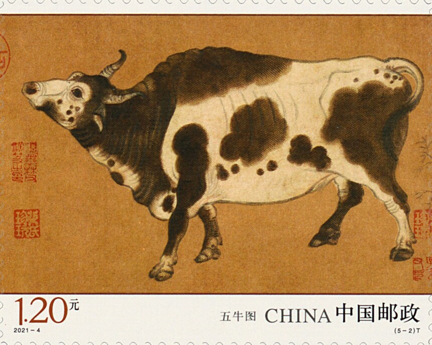 中国邮政定于2021年3月20日发行《五牛图》特种邮票1套5枚,小型张(无齿孔)1枚。详情如下: