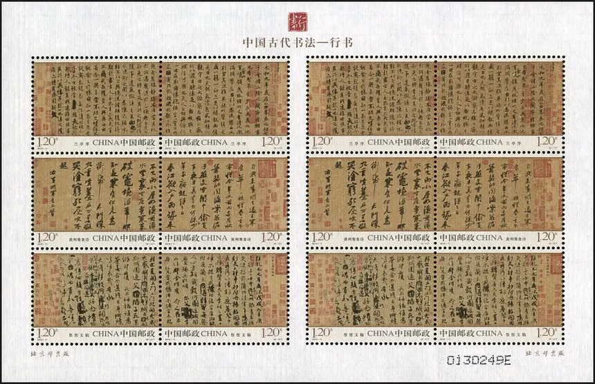 中国邮政定于2010年5月15日发行《中国古代书法-行书》特种邮票1套6枚。详情如下: