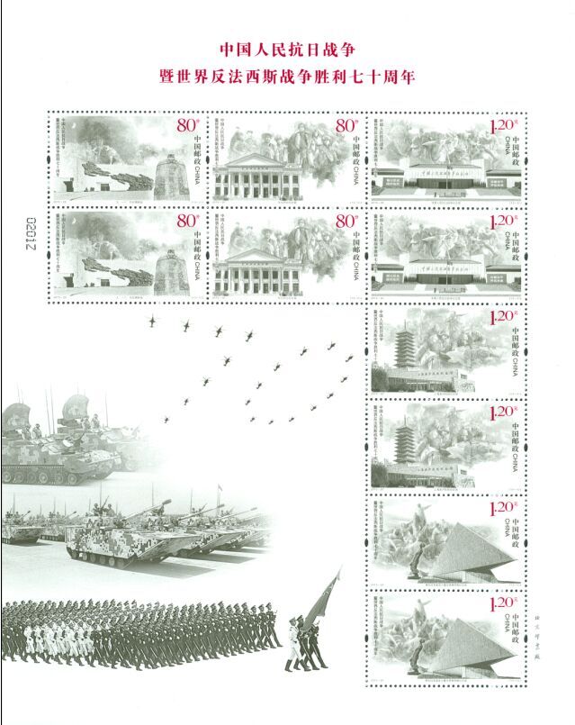 中国邮政定于2015年9月3日发行《中国人民抗日战争暨世界反法西斯战争胜利七十周年》纪念邮票1套13枚,小型张1枚。详情如下: