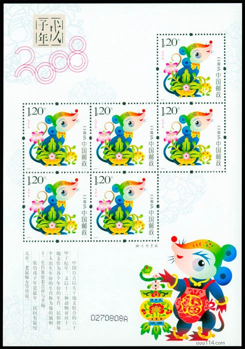 国家邮政局定于2008年1月5日发行《戊子年》特种邮票1套1枚,小本票1本。详情如下: