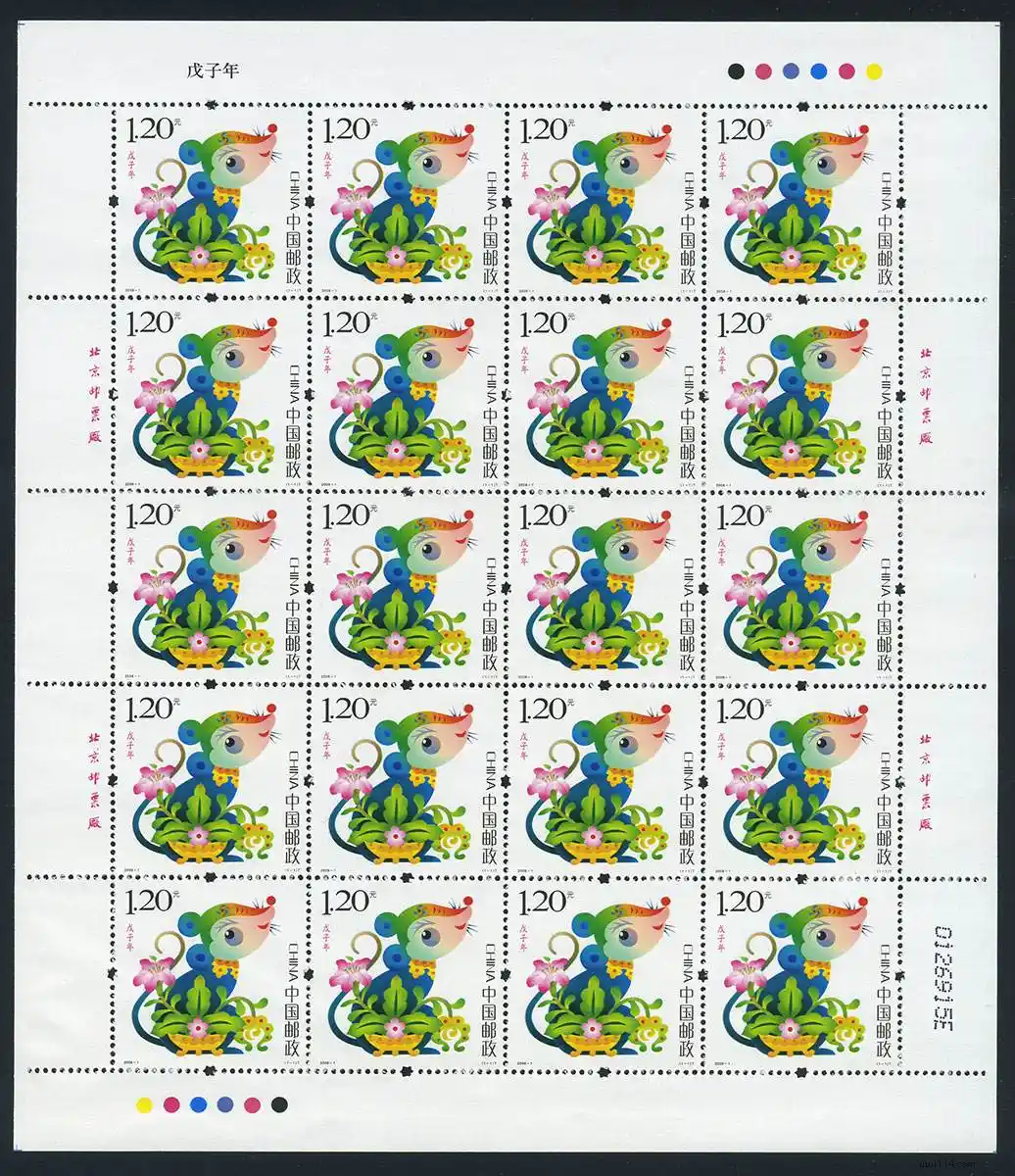 注:同时发行《戊子年》邮票版式三(整张枚数:4枚;整张规格:120×130毫米),作为2008年纪特邮票全额交款预订户赠品。