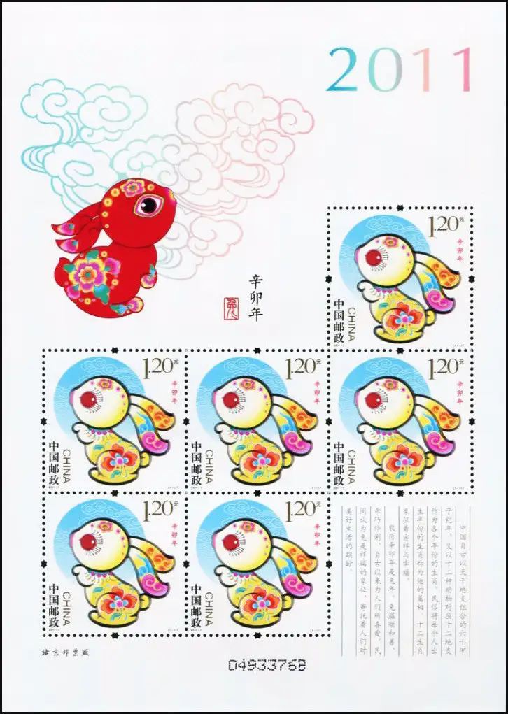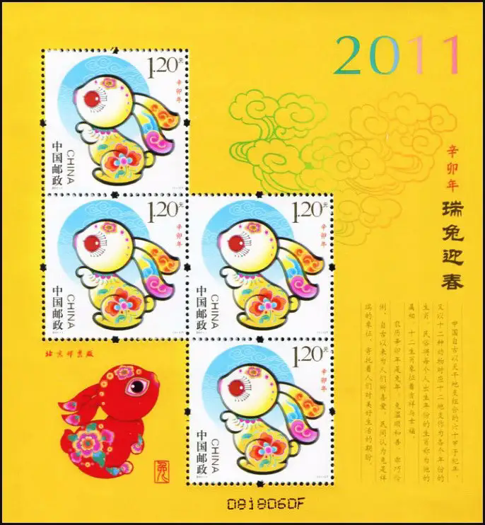 注:发行《辛卯年》邮票版式三(整张枚数:4枚;整张规格:120×130毫米),作为2011年纪特邮票全额交款预订户赠品。