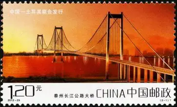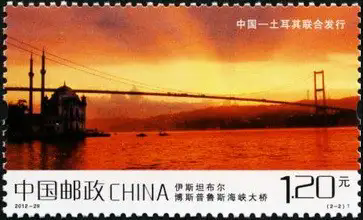 中国邮政定于2012年11月26日发行《泰州长江公路大桥与伊斯坦布尔博斯普鲁斯海峡大桥》特种邮票1套2枚(与土耳其联合发行)。详情如下: