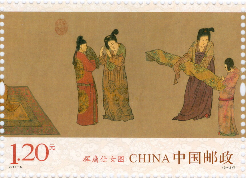 中国邮政定于2015年3月22日发行《挥扇仕女图》特种邮票1套3枚,小型张1枚。详情如下: