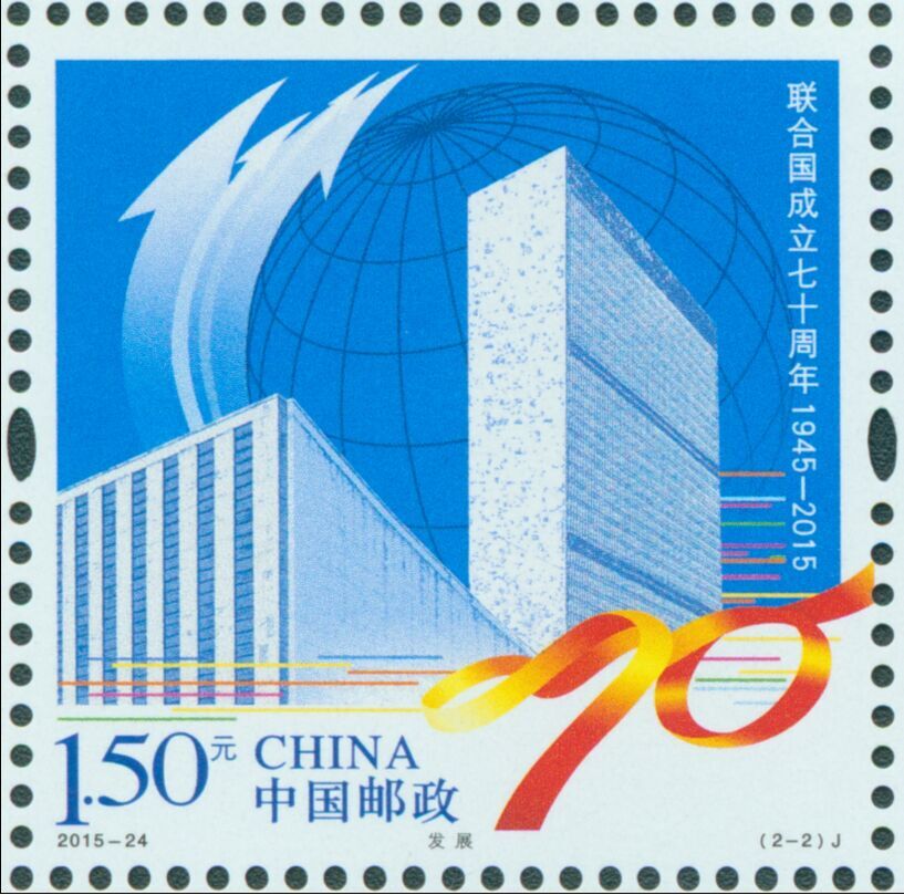 中国邮政定于2015年9月26日发行《联合国成立七十周年》纪念邮票1套2枚。详情如下: