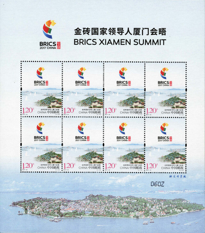 中国邮政定于2017年8月19日发行《金砖国家领导人厦门会晤》纪念邮票1套1枚。详情如下: