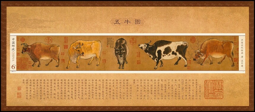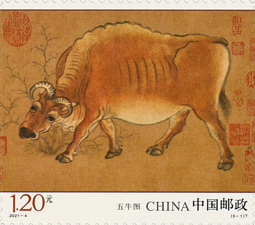 中国邮政定于2021年3月20日发行《五牛图》特种邮票1套5枚,小型张(无齿孔)1枚。详情如下: