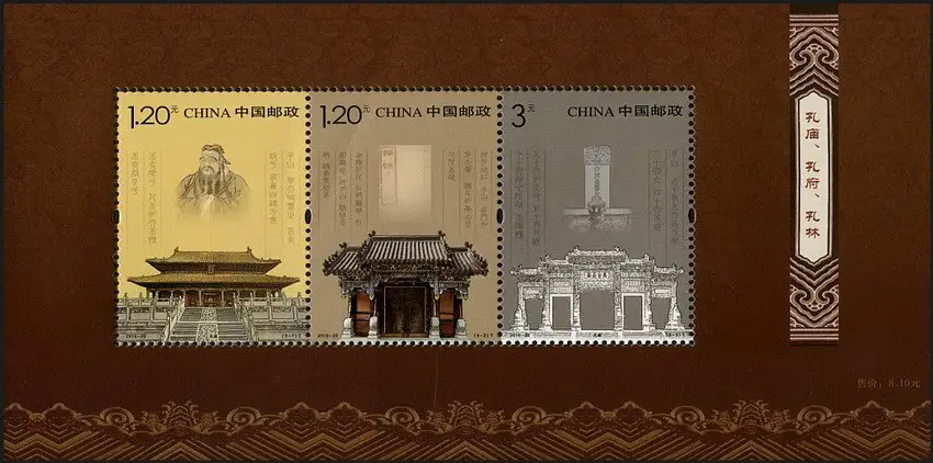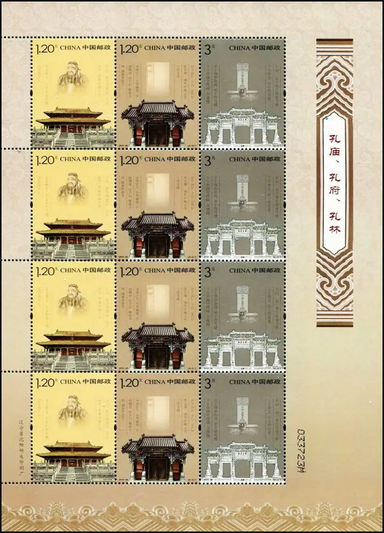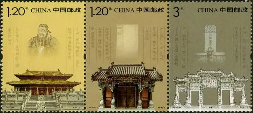 中国邮政定于2010年9月28日发行《孔庙、孔府、孔林》特种邮票1套3枚,小全张1枚。详情如下: